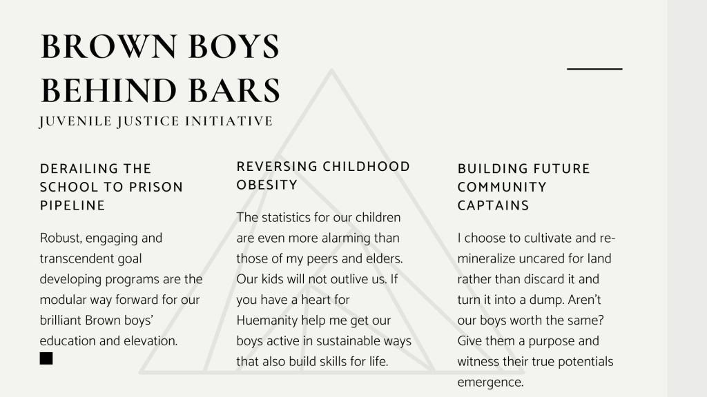 Below is my mode of aspiration and operation to undo the intergenerational traumas and horizontal oppressions that have occurred for those who resemble my younger trials and conditions. Through the Brown Boys Behind Bars Initiative I truly hope to wholistically impact my community and the world in a massive way.